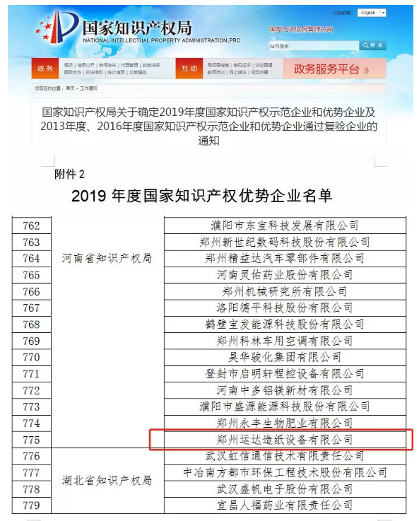 2019年12月,國(guó)家知識(shí)產(chǎn)權(quán)局公布2019年度國(guó)家知識(shí)產(chǎn)權(quán)示范企業(yè)和優(yōu)勢(shì)企業(yè)名單,鄭州運(yùn)達(dá)造紙?jiān)O(shè)備有限公司榜上有名。
