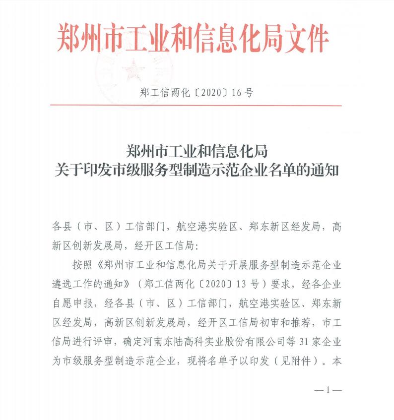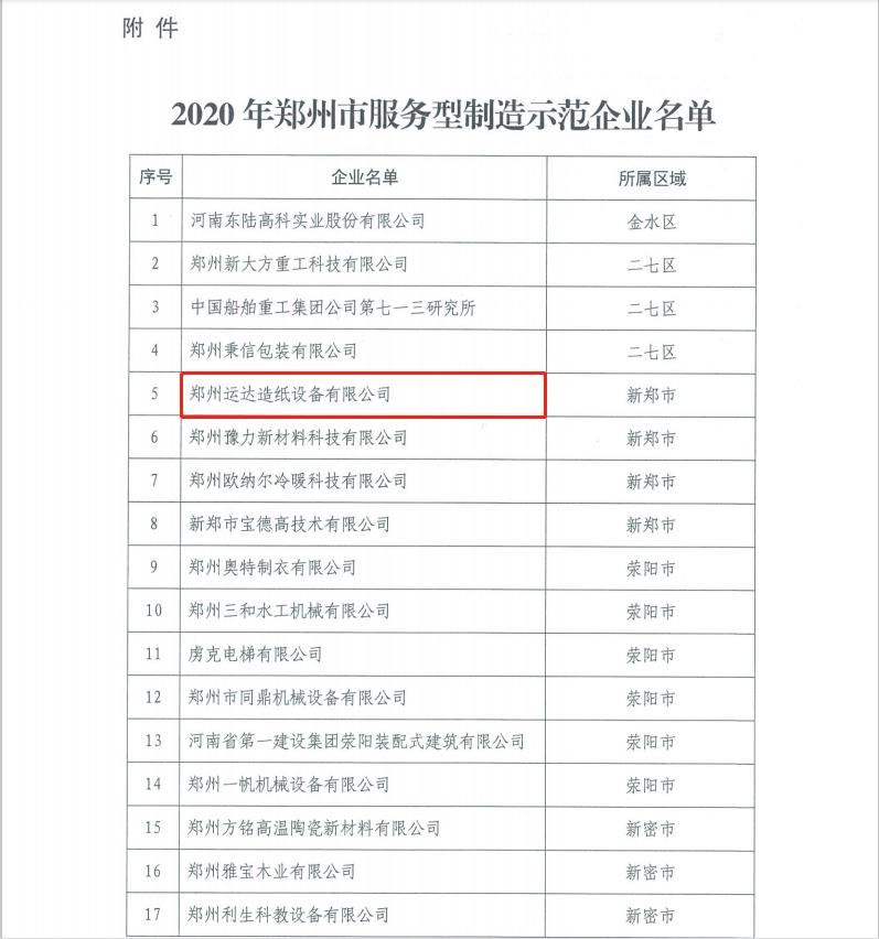 7月6日,鄭州市工業(yè)和信息化局發(fā)布了《2020年鄭州市服務(wù)型制造示范企業(yè)名單公示》通知,鄭州運(yùn)達(dá)造紙?jiān)O(shè)備有限公司被遴選為2020年鄭州市服務(wù)型制造示范企業(yè)。鄭州運(yùn)達(dá)從全市數(shù)百家企業(yè)中脫穎而出,成為31家獲評鄭州市服務(wù)型制造示范企業(yè)中的一員,此次是鄭州運(yùn)達(dá)從生產(chǎn)型制造向服務(wù)型制造成功轉(zhuǎn)型的重要成果。