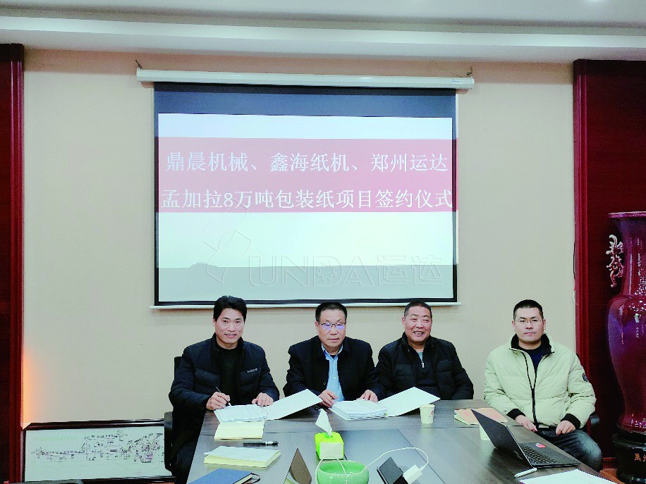 由鼎晨機(jī)械、鑫海紙機(jī)和鄭州運(yùn)達(dá)三方合作,孟加拉國8萬噸箱板紙項(xiàng)目正式簽約——運(yùn)達(dá)國際業(yè)務(wù)部2021年牛年迎來開門紅。
